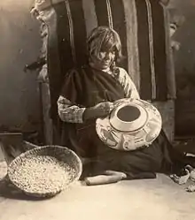 Los Hopi hacen cerámicas pintadas con hermosos diseños, y se considera a Nampeyo una de las mejores alfareras Hopi. Nampeyo aprendió a hacer cerámica gracias a los esfuerzos de su abuela paterna. A partir de la década de 1870, obtuvo una fuente estable de ingresos vendiendo su trabajo en un puesto comercial local de Thomas Keam.[12] En 1881 ya era conocida por sus trabajos de alfarería "antigua Hopi" de Walpi.[11]