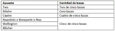 Wellington | 5/5-El declarante abre el carteo con la carta más baja sin ser de palo de triunfo. | Veinte puntos de cada jugador al declarante. | Diez puntos a cada jugador del declarante. |