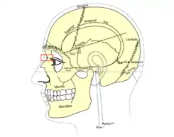 Vista lateral de la cabeza que muestra las relaciones de los huesos en la superficie. (El hueso nasión aparece marcado al centro a la izquierda).