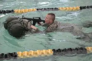 En la instrucción militar, la natación vestida es una técnica obligatoria que se enseña en todo el mundo. Los militares deben nadar vistiendo uniforme de combate, portando su fusil y aferrándose a la mochila de campaña como flotador, además de cualquier otro eventual elemento.