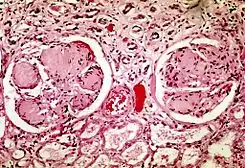 ![]() Dos glomérulos en la nefropatía diabética: las áreas acelulares de color púrpura claro dentro de los mechones capilares son los depósitos destructivos de la matriz mesangial. | ||