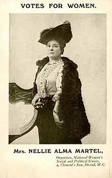 Charles regresó a Inglaterra en 1904 y Nellie lo hizo ese mismo año algo más tarde, el 27 de julio; siguió siendo un sujeto frecuente de la revista feminista dirigida por Louisa Lawson, The Dawn. En Londres se hizo conocida como una mujer que había sido candidata al parlamento y se unió a la Unión Social y Política de las Mujeres (WSPU por sus siglas en inglés) de Emmeline Pankhurst en mayo de 1905. Martel leyó una petición de protesta en una reunión como respuesta a la demora de un proyecto de ley sobre el derecho al voto de las mujeres y se convirtió en miembro del comité central de la WSPU en 1906, dando a conocer los derechos democráticos de que disfrutaban las mujeres australianas.