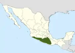 Endémica del territorio mexicano en los estados de Colima, Guerrero, Jalisco, Michoacán, Morelos, Oaxaca y Puebla.[2][4]