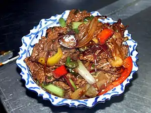 Nuea pad prik servido en un plato (filetes con chiles).