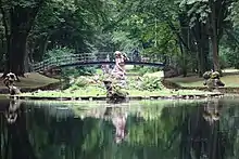 finales del 18 A principios del siglo XIX, el parque se convirtió en un parque de "estilo inglés" con plantación libre por instrucciones del margrave Karl Alexander. [21] Se eliminaron los elementos barrocos del jardín, que requerían un cuidado especial, y los caminos se dispusieron en parte para que fueran sinuosos. En 1795, en honor a la reina Luisa, [22] se erigió en el extremo sur un pequeño templo redondo, llamado monopteros, con el templo del sol. En la noche del 12 El 1 de junio de ese año, se llevó a cabo un gran festival para la pareja real en el jardín del patio, al que todos fueron bienvenidos con entrada libre. 6000 lámparas iluminaron el parque y se encendió un gran espectáculo de fuegos artificiales. [23]