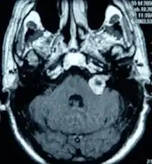 Neurinoma acústico con un tamaño de 20 x 22 x 25 mm. RMN en corte axial a nivel de globos oculares.