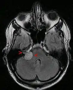 • Tumores de gran tamaño (más de 3 cm de diámetro). Son aquellos que comprimen ya el tronco cerebral produciendo, además de los síntomas previos, dolor de cabeza, que puede ser generalizado y con episodios de dolor severo occipital irradiado hacia abajo a la columna vertebral, asociado con retracción de la cabeza y el cuello, aturdimiento, perdida de la agudeza visual e incluso alteraciones de la personalidad. Si un tumor de este tamaño se deja evolucionar sin tratamiento puede producir la muerte del paciente, pues aunque sea benigno, el lugar en el que crece puede afectar a estructuras esenciales para la vida.