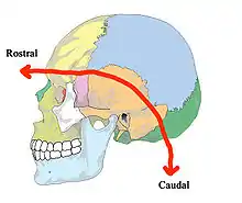 El desarrollo embrionario puede ayudar a comprender la estructura del cerebro adulto porque establece un marco sobre el que se pueden construir estructuras más complejas. Primero, el tubo neural establece la dimensión anteroposterior del sistema nervioso, que se denomina neuroeje. Se puede decir que el sistema nervioso embrionario de los mamíferos tiene una disposición estándar. Los humanos (y otros primates, hasta cierto punto) lo complican al ponerse de pie y caminar sobre dos piernas. La dimensión anteroposterior del neuroeje se superpone a la dimensión superior-inferior del cuerpo. Sin embargo, existe una curva importante entre el tronco encefálico y el prosencéfalo, que se denomina ángulo cefálico. Debido a esto, el neuroeje comienza en una posición inferior (el extremo de la médula espinal) y termina en una posición anterior, la parte frontal del cerebro. Esto puede resultar confuso y se puede ilustrar cuando se mira a un animal de cuatro patas de pie sobre dos patas. Sin la flexión en el tallo cerebral y en la parte superior del cuello, ese animal estaría mirando hacia arriba en lugar de hacia el frente.[1]