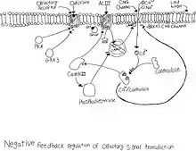 La neurona del receptor olfativo tiene una respuesta de retroalimentación negativa de funcionamiento rápido tras la despolarización. Cuando la neurona se despolariza, el canal iónico CNG se abre permitiendo que el sodio y el calcio entren en la célula. La entrada de calcio inicia una cascada de acontecimientos dentro de la célula. El calcio se une primero a la calmodulina para formar CaM. La CaM se unirá entonces al canal CNG y lo cerrará, deteniendo la entrada de sodio y calcio.[10] La CaMKII se activará por la presencia del CaM, que fosforilará el ACIII y reducirá la producción de AMPc [11] La CaMKII también activará la fosfodiesterasa, que entonces hidrolizará el AMPc.[12] El efecto de esta respuesta de retroalimentación negativa inhibe a la neurona de una mayor activación cuando se introduce otra molécula de olor.