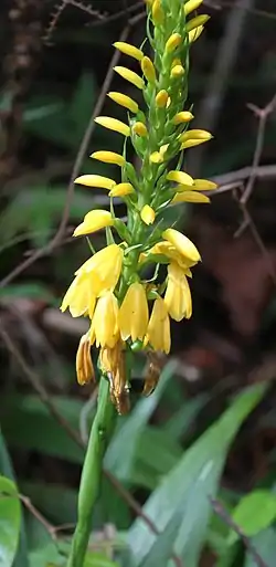 Es una orquídea de tamaño grande, prefiere clima cálido y tiene hábito terrestre con un tallo erecto que lleva 10 hojas, dísticas , estrechamente lanceoladas, acuminadas y agudas, de tamaño variable. Florece en una inflorescencia de 50 + cm de largo, con 40 a 80 flores, con brácteas lineares, agudas y portando flores fragantes.[2]