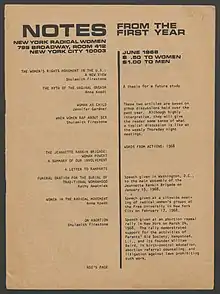 Notes from the First Year se basa en los discursos pronunciados por los miembros y los debates desatados en las reuniones semanales de New York Radical Women en 1968. Este folleto formaba parte de un movimiento de diarios mimeografiados que coincidió con el nuevo feminismo radical que explotó en Estados Unidos.[14] Muchos fragmentos de este folleto fueron fundamentales en el desarrollo de lo que ahora llamamos estudios de mujeres y de género.[2] El folleto incluye El mito del orgasmo vaginal de Anne Koedt.