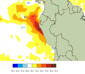 El Niño costero, también llamado Fenómeno de El Niño costero (FEN costero) o El Niño Oriental,[1] es un evento climatológico que consiste en el calentamiento anómalo de las aguas del Océano Pacífico ecuatorial en las proximidades de las costas sudamericanas, lo que implica que afecta el clima de países como Perú, Ecuador y en ocasiones precisas a Chile.[2] Es un fenómeno local que no afecta el clima a nivel mundial, por lo que hay que resaltar la diferencia con El Niño, el cual es un fenómeno climático global de mayores dimensiones que consiste en el calentamiento anómalo del Pacífico central y ecuatorial. Es por esto que se considera que el Niño costero, a diferencia de El Niño global, no está relacionado directamente con el patrón climático ENOS (El Niño-Oscilación del Sur).[3]