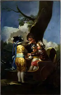 Estaba destinado a una sobrepuerta, de allí su formato. Entregado en enero de 1779, Goya percibió 1000 reales de vellón por él. Muestra un festivo ambiente madrileño, como El cacharrero y La acerolera. Nuevamente Goya toca el tema de la infancia, como ya lo había hecho en Niños jugando a soldados y Muchachos cogiendo fruta. En esta ocasión dos niños están montados en un carretón tocando instrumentos.