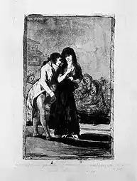 Hay dos dibujos preparatorios, conservados en el Museo del Prado, el primero en aguada a tinta china, pertenece al álbum B y es de ejecución detallada. La pareja tiene detrás una maja de pie que en la estampa aparece sentada. En el segundo dibujo realizado a la aguada en tinta china, está escrito a lápiz: Por haberle yo dicho que tenía buen movimiento no puede hablar sin colear. Aparecen varias figuras y un edificio al fondo que suprimió en el grabado, aunque la pareja principal está fielmente reproducida. En la estampa se repite la cabeza del dibujo que se vislumbra entre el hombre y la maja.[3]