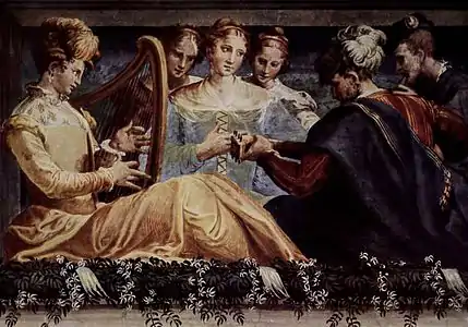 - Paisaje con damas y jinetes, Óleo sobre lienzo, 116 x 119 cm, Galería Borghese (Roma).
