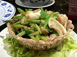 El nido o cesta comestible que contiene el marisco está completamente hecho de taro frito. Se usan diferentes trenzados en su elaboración, si bien en todos los casos la cesta es dura y crujiente.