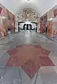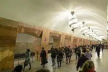 1979, la estación Marksistskaya también conocida como la estación "marxista" fue un proyecto de diseño conjunto con Volovich y Samoilova con la participación de RP Tkacheva (en en ruso, Р. П. Ткачёва ) y el artista Alekseev. [29] La estación era una de las favoritas de Alióshina y ella la describió como "el metro más hermoso del mundo". [30] Se suponía que el diseño de la estación transmitía la fuerza y pureza de la ideología marxista . En ese sentido, el vestíbulo de la estación estaba revestido con mármol rojo Burovshina en las columnas y un mármol rosa Gazgan en las paredes con granito negro en la base. [29] El mármol rosa y rojo procedía de la zona cercana al lago Baikal . [3] Alekseev creó paneles en la pared del fondo y sobre los pasillos al estilo del mosaico florentino que representan temas marxistas. [29] Los candelabros estaban hechos de vidrio óptico que tuvo que reducirse en espesor debido al peso de los accesorios en espiral. [3]