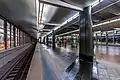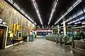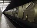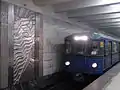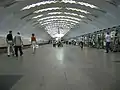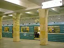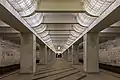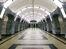 1975, la estación Shchukinskaya, como la estación Kuznetsky Most, unió a Alióshina con Samoilova y Alekseyev. [7] El diseño presentaba columnas estriadas de mármol Gazgan amarillento en las que las ranuras verticales estaban rellenas con una aleación de bronce y aluminio anodizado . [26] [7] Los detalles del suelo presentaban un granito gris en una cadena abierta que viajaba a lo largo del pasillo y las paredes estaban revestidas con mármol rojo ucraniano. [26] Pegados a las paredes había paneles de aluminio corrugado del mismo aluminio anodizado y bronce. Fue la primera vez que el material se utilizó a una escala tan grande, [7] ya que anteriormente, se utilizó para prohibir la corrosión en las palas de los helicópteros. [26]
