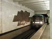 1978, la estación Medvedkovo fue otra colaboración de Alióshina y Natalia K. Samoilova y con la participación de VS Volovich (en en ruso, В. С. Волович ) y nuevamente contó con obras de arte de MN Alekseev. [27] La estructura prefabricada presentaba filas de 26 columnas, revestidas de mármol de grano amarillo y rosa con inserciones de acero inoxidable. Las paredes de las vías estaban revestidas con mármol rojo y presentaban paneles de bronce y aluminio anodizado con formas piramidales para representar el hielo. [28] El tema de la estación era la naturaleza del norte y las inserciones decorativas en los paneles de metal representaban escenas del medio ambiente. [27] Las inserciones esculpidas de Alekseev mostraban varias imágenes que incluían gansos en vuelo, un cazador apuntando a gansos y otro oso cazador, un oso polar en un témpano de hielo, un trineo tirado por renos y otras imágenes. [28] El suelo era de granito gris y negro. [27]