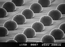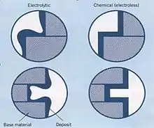 Una ventaja significativa del proceso de níquel no electrolítico es la capacidad de producir depósitos con un espesor uniforme en piezas con geometrías y formas complejas.[12] Como se trata de una reacción química, cualquier catalizador superficie expuesta a la solución de metalización se placa de manera uniforme, que se adecue los criterios establecidos unos pocos párrafos antes. La densidad de corriente afecta típicamente asociados con galvanoplastia no son un factor, por lo tanto, los bordes afilados, rebajes profundos y agujeros ciegos son fácilmente chapada de espesor uniforme con la química de níquel no electrolítico. Muchas aplicaciones de níquel electrolítico existen hoy en día porque a menudo es la única forma de ciertos componentes de la placa. La diferencia en la uniformidad de depósito se ilustra en la figura 1. La figura 2 es una foto de golpes ES enchapadas en un flip chip, algo imposible de lograr con un depósito galvanizado.
