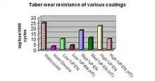 El desgaste por abrasión de las películas de la PEV se mide típicamente mediante la aplicación de una acción mecánica de un disco abrasivo, girando sobre la superficie chapada y midiendo la pérdida de peso (en miligramos) del recubrimiento a intervalos de 1000 ciclos. Esta prueba se conoce como el índice de desgaste Taber (IST). Y tal vez es el método utilizado más frecuentemente para evaluar las características de desgaste de las películas de la PEV.[25] Los resultados típicos de pérdida de peso de varias películas se ilustra en la Figura 10.