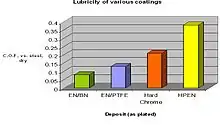 Como se señaló anteriormente, la lubricidad juega un papel importante en la optimización de la resistencia al desgaste. Lo hace por contacto entre la inhibición de las superficies de contacto, reduciendo la fricción y el calor asociado. Hard Chrome es bien conocido como poseedor de una película de la curación y auto lubricados. Considerando que la ES no presenta esta característica todavía ofrece una excelente lubricidad y encuentra muchas aplicaciones que pueden sacar provecho de esta propiedad.[28] La figura 11 muestra gráficamente el coeficiente de fricción vs no lubricado de acero. Cromo duro se desempeñan mejor que el estándar alto de fósforo ES (HP ES), pero con la oclusión de diversas partículas blandas que pueden alcanzar valores mucho más bajos.