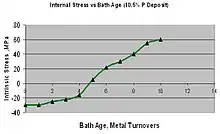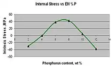 La tensión intrínseca es causada por el proceso de galvanizado en sí. Aunque el sustrato también juega un pequeño papel, la tensión intrínseca es controlada por la formación de las capas de níquel debido principalmente a la formulación ES y condiciones de operación del baño. Una observación general para orientar su proceso de pensamiento sería que el aumento de fósforo ES procesos efectuados de acuerdo con las buenas prácticas se producen depósitos con el estrés neutral o de compresión. En la mayoría de las aplicaciones, el esfuerzo de compresión se desea, ya que tiene un efecto insignificante sobre la pérdida de la fatiga, mejora la adhesión y algunas han encontrado una mejor protección a la corrosión. El gráfico de la figura 12 refleja la tensión de depósito frente a contenido de fósforo. Nótese que la reducción de fósforo (menos de 4% en peso) en la película también exhiben menor esfuerzo de tracción. Esto puede atribuirse a la presencia de fases homogéneas estructurales que Duncan observó.[30]