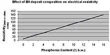 La resistividad eléctrica de las aleaciones de níquel químico es mayor que la de níquel puro. El níquel de alta pureza tiene una resistividad específica de 7,8 x 10-6 ohm-cm. Aumentando el contenido de fósforo aumenta la resistividad eléctrica de la película. (Figura 4). Los valores van desde 30-100 x 10-6 ohm-cm. El tratamiento térmico de la película PEV puede afectar la resistividad. A temperaturas tan bajas como 150 °C la resistividad se reducirá debido a la liberación de hidrógeno absorbido físicamente. A temperaturas superiores a 250 °C, una disminución similar marcado se producirá como resultado de la migración de fósforo y la transformación estructural de fosfuro de níquel.[15]