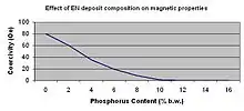 Una aplicación importante del níquel químico es como una subcapa para los discos duros para computadoras. Para cumplir con los requisitos, el recubrimiento debe permanecer no magnético, incluso después de una hora de duración los ciclos de horneado de 250-300 °C. En los últimos años, la industria de almacenamiento de datos ha elevado a la parte alta de este rango de temperaturas. Esto sólo se puede lograr con aleaciones alto contenido en fósforo (P> 10,5%) o con aditivos específicos. La propiedad no magnético de estas películas de fósforo es una de las características físicas más importantes.[16] La figura 5 muestra el efecto del contenido de fósforo sobre el ferromagnetismo.