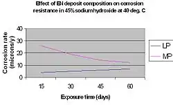 La naturaleza del ambiente corrosivo y la resistencia al ataque químico son criterios importantes cuando se selecciona un determinado recubrimiento para un rendimiento óptimo. Los recubrimientos de alto contenido en fósforo (10.12%) son más fácilmente atacado en medios altamente alcalinos que de baja concentración de fósforo (1-3%). Sin embargo, los primeros resisten mucho mejor en un medio ácido.[19] Esto se ilustra en los siguientes gráficos.