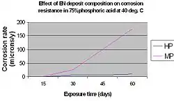 El uso de pulverización de sal neutra, de acuerdo con la especificación ASTM B 117, para la medición de resistencia a la corrosión está bien documentado en la literatura y sigue siendo el método más ampliamente aceptado para la evaluación de un revestimiento.[23] Los resultados de la exposición de niebla salina neutra, contenido de fósforo y el espesor de depósito se resumen en la siguiente tabla: