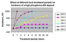 En los casos en que el sustrato no puede soportar los requisitos de temperatura para alcanzar la máxima dureza, a menudo, se recomienda el empleo de baja concentración de fósforo. El aumento de la microdureza de películas se atribuye a las transformaciones de fases que tienen lugar durante el ciclo de calentamiento para formar níquel metálico y fosfuro de níquel. Se producirá algunos contracción de volumen y agrietamiento de la película y se debe tener en cuenta si la aplicación requiere protección contra la corrosión.