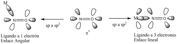 Según la regla de los 18 electrones, el NO puede actuar como ligando a 1 o 3 electrones según el contaje electrónico covalente. Como ligando a 1 electrón el NO se enlaza al átomo metálico de mostrando una geometría angular mientras que el NO a 3 electrones muestra una geometría lineal.