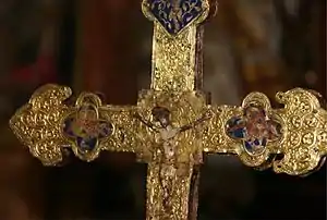 Está hecha en plata sobredorada con esmaltes en el último cuarto del siglo XIV, tal vez aprovechando las placas esmaltadas del siglo XIII. El Cristo fundido del anverso es ya del siglo XVI.[8]