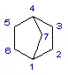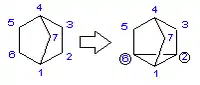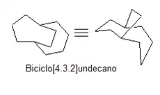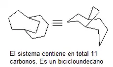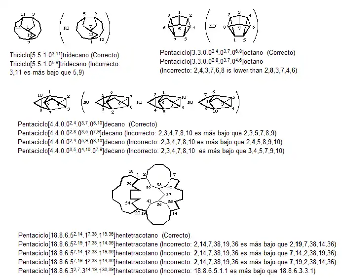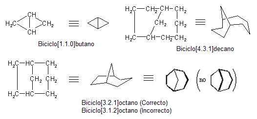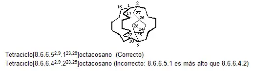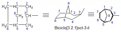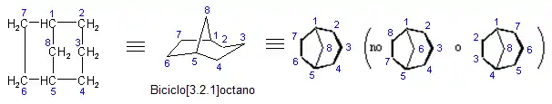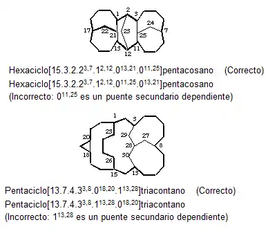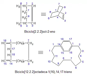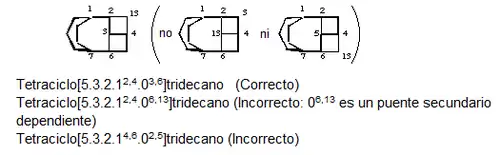 - la serie de números de puentes encerrados entre corchetes en orden descendente separados por puntos. Los tres primeros puentes deben ser los del biciclo principal, mientras que los puentes secundarios se indican escribiendo el número de carbonos del puente y, como subíndices y separados por comas, los números localizadores del puente con respecto al ciclo principal.