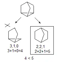 1) Se busca primero el compuesto bicíclico que contenga los puentes más largos (Puentes principales). El resto de los puentes se denominan puentes secundarios. Para saberlo, se elimina un puente no equivalente y se suman los puentes restantes. Se hace la misma prueba con el resto de los puentes y la suma más alta es la que da el biciclo indicado: