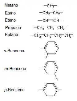 • Los sustituyentes generados de estos sistemas se indican con la valencia libre ubicada con el localizador establecido conforme a la numeración original: