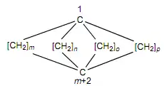El Sistema de Nomenclatura de Hidrocarburos con Puentes (Bridged polycycles en inglés) es un método para nombrar hidrocarburos derivados de monocíclicos que presentan una cadena lateral de carbono que se vuelve a conectar en el monociclo para formar un nuevo compuesto cíclico. Al repetirse esta operación se pueden generar triciclos, tetraciclos, pentaciclos, etc.[1] Si la cadena lateral se cicla en el carbono de inicio, se obtiene un compuesto espiro; si se cicla en una posición vecina al carbono de inicio, se obtiene un compuesto bicíclico fusionado. Si se cicla sobre otra posición distinta a las mencionadas previamente, se obtiene un hidrocarburo bicíclico con puentes.[2]
