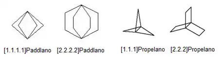 Los paddlanos son hidrocarburos tricíclicos saturados con dos átomos de carbono como cabeza de puente unidos a través de cuatro puentes. Su nombre genérico sistemático es triciclo[m.n.o.p1,(m+2)] alcanos. Se ha definido una nomenclatura semisistemática para referirlos como [m.n.o.p] paddlanos (Cuando p=0, se denominan propelanos).[23]
