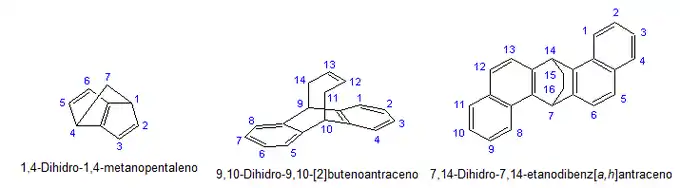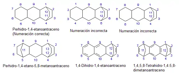 Cuando los sistemas policíclicos fusionados presentan además un puente, el nombre de éste se subordina al del sistema de fusión. Los puentes se nombran citando los dos localizadores donde se encuentra el puente con respecto al sistema de numeración del sistema fusionado y el nombre del puente, el cual tiene el mismo nombre del hidrocarburo sin enlazar:[6]