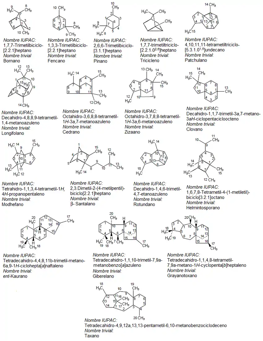 Diversos sistemas terpénicos presentan esqueletos policíclicos en sus estructuras. La numeración está basada en su origen biosintético. Cabe mencionar al bornano, canfano, pinano, cedrano, taxano, giberelano y kaurano.[7][8]