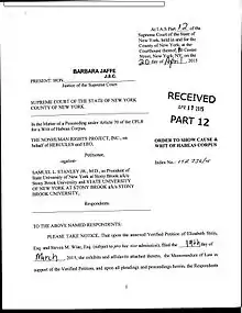 - «AMENDED Order To Show Cause and Writ of Habeas Corpus». New York Supreme Court, Fourth District. 21 de abril de 2015. Archivado desde el original el 12 de marzo de 2016. Consultado el 27 de enero de 2017.