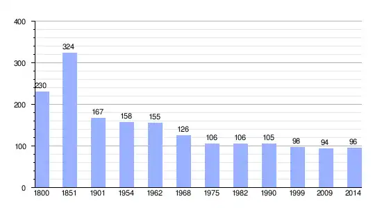 Los datos demográficos contemplados en este gráfico de la comuna de Normandel[4]se han cogido de 1800 a 1999 de la página francesa EHESS/Cassini, y los demás datos de la página del INSEE.[5]