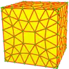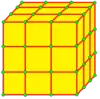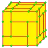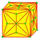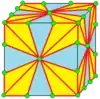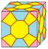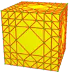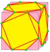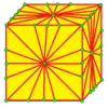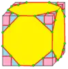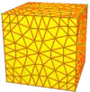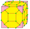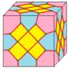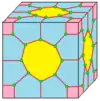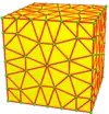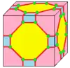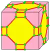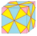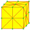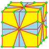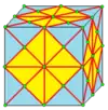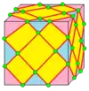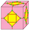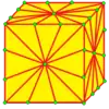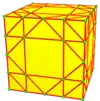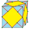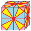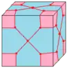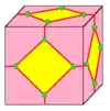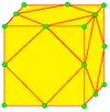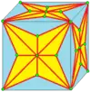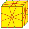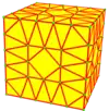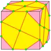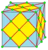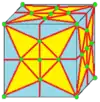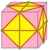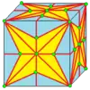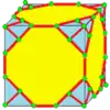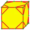 Kis levanta una pirámide en cada cara, y también se le llama akización, kleetopo, acumulación,[11] acreción o aumento piramidal. El truncado corta el poliedro en sus vértices pero deja una porción de los bordes originales.[12] El operador Zip también se denomina bitruncamiento. | |