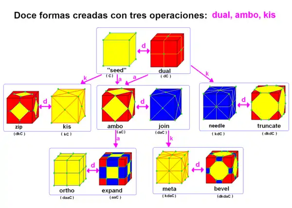 Conway y Hart ampliaron la idea de utilizar operadores, como el truncamiento definido por Johannes Kepler, para construir poliedros relacionados con la misma simetría. Por ejemplo, tC representa un cubo truncado y taC, analizado como t(aC), es (topológicamente) un cuboctaedro truncado. El operador más simple, la conjugación intercambia elementos vértices y caras para obterner figuras duales; por ejemplo, el dual de un cubo es un octaedro: dC= O. Aplicados en serie, estos operadores permiten generar muchos poliedros de orden superior. Conway definió los operadores a (ambo), b (bisel), d (dual), e (expandir), g (giro), j (unir), k (kis), m (meta), o (orto), s (achatar) y t (truncar), mientras que Hart agregó r (reflejar) y p (hélice).[3] En versiones posteriores se nombraron operadores adicionales, a veces denominados operadores extendidos.[4][5] Las operaciones básicas de Conway son suficientes para generar los sólidos arquimedianos y los sólidos de Catalan a partir de los sólidos platónicos. Algunas operaciones básicas se pueden realizar como compuestos de otras: por ejemplo, el ambo aplicado dos veces es la operación de expansión (aa= e), mientras que un truncamiento después del ambo produce un bisel (ta= b).