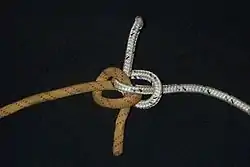 - Pase cada uno de los extremos libres alrededor del lazo en la otra cuerda, y luego por el "túnel" creado por las dos cuerdas.