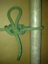 El diagrama que se muestra a continuación explica la secuencia para su atado, el punto verde representa un punto fijo tal como un árbol o poste al cual se fija el cordel. Luego de pasar un extremo por debajo del punto de fijación, realizar un lazo que luego es colocado sobre el cordel tal como se muestra en la fig. 1. Una vez completado el paso previo tomar el lazo y envolverlo alrededor de la línea (siguiendo las direcciones indicadas por las flechas rojas) hasta llegar a la situación que se muestra en la fig. 4. Luego tomar el extremo del cordel y crear un lóbulo (nudo) en él. Seguir la flecha roja de la fig 4 que muestra como el loop se desliza por debajo y a través del hueco de la soga para armar el sistema rápido de desarmado. Una vez que el nudo ha sido ajustado debe ser capaz de resistir una carga importante sobre la línea a la vez que es fácil de ajustar y se lo puede desarmar rápidamente.