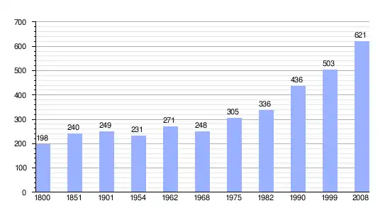 Los datos demográficos contemplados en este gráfico de la comuna de Nuelles[5] se han cogido de 1800 a 1999 de la página francesa EHESS/Cassini, y los demás datos de la página del INSEE.[6]
