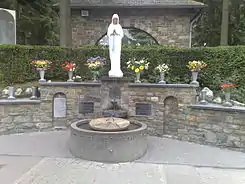 ![]() Estatua y fuente en donde la Bienaventurada Virgen María guio a Mariette y la instruyó como agua reservada a todas las naciones con tal de curar a los enfermos . | ||