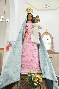 El presbítero Juan Esteban Rodríguez de Lamas, quien al conocer la próxima creación de la parroquia eclesiástica de Naguanagua, propone como patrona a María Madre de Dios, bajo la advocación de Nuestra Señora de Begoña, a la vez que donó la imagen de Begoña que él veneraba en el oratorio de su hacienda, siendo él mismo quien institucionalizó sus fiestas mediante escritura de obligación notariada de fecha 6 de marzo de 1783. Se cree que desde el 15 de agosto de 1804, fecha en la cual la construcción de la iglesia llegó a su final, la imagen descansa en el santuario, que lleva el mismo nombre.[4]